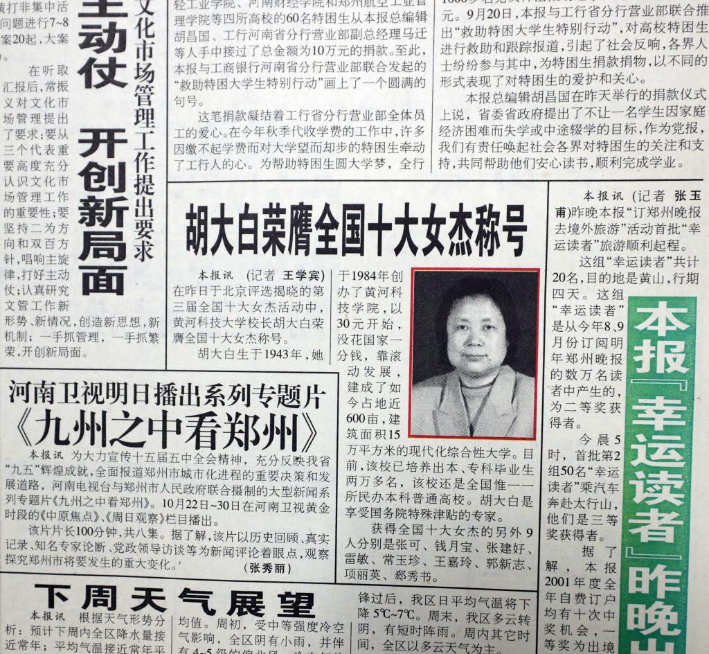 1984年11月,河南省举办首届高等教育自学考试,合格率只有6%。出于关爱学生的本能,学校创办人、董事长胡大白决心行动起来办高等教育自学考试辅导班,帮助那些没能进入大学校园,立志学习的学子们完成大学学业。她与出身教育世家的丈夫杨钟瑶一拍即合,倾其所有,在克服了“无资金、无校舍、无师资、无设备”的一系列困难后,创办了郑州市高等教育自学考试辅导班,为想要上大学、拿到大学学历的学子们进行专业辅导。当时正在郑州市人民政府办公厅南锅炉房当工人的任进书成为了我校高等教育自学考试辅导班首届学生,在学校提供的优秀师资和良好的教学环境下,任进书经过刻苦学习最终由一名普通锅炉工成长为一名省会县处级公务员,实现了他人生的跨越式发展。