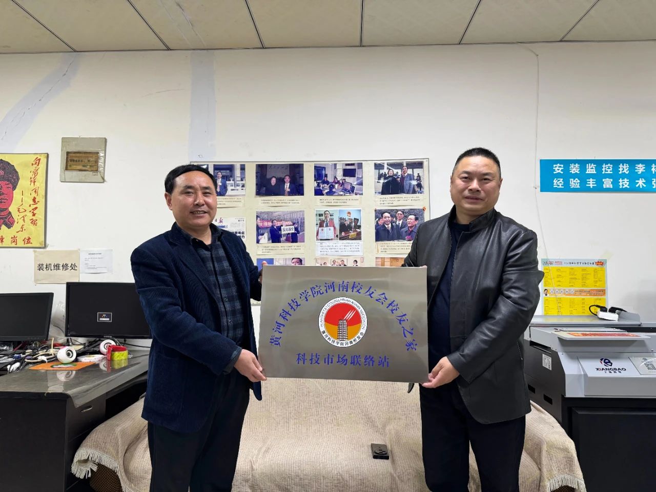 大家首先走访了1991级中文专业校友李祥。贺勇为李祥校友授牌,正式设立“河南校友会校友之家科技市场联络站”。作为郑州创谷汇商贸有限公司总经理,李祥深耕商贸领域多年,并担任河南省人大特邀公民代表及郑州市多项公共事务听证会代表等社会职务,展现了校友的卓越影响力和社会担当。交流中,校友们共忆校园时光,畅谈创业历程,现场氛围热烈浓厚。
