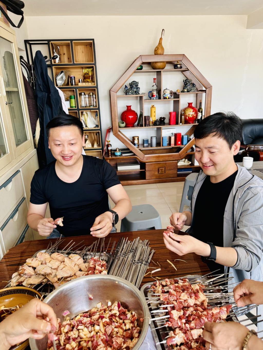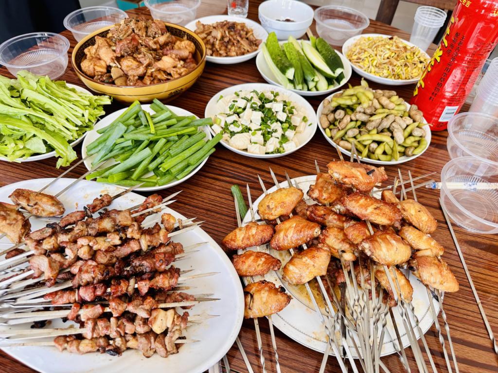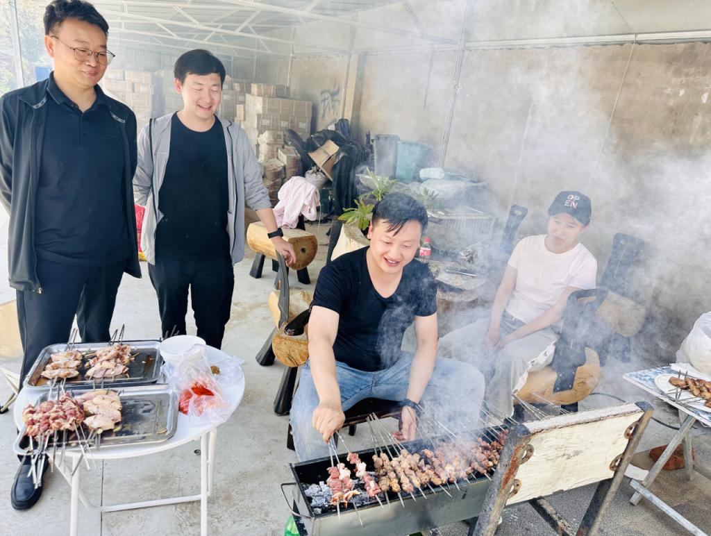 房中桌上,羊肉与奥尔良鸡翅已腌制入味,副会长陈艳竹带头挽袖,理事高建华伉俪、副秘书长朱伟等围坐穿签成串。孩子们逗着猫,在鸡舍里看鸡鸣,体验着平时感受不到的乐趣。