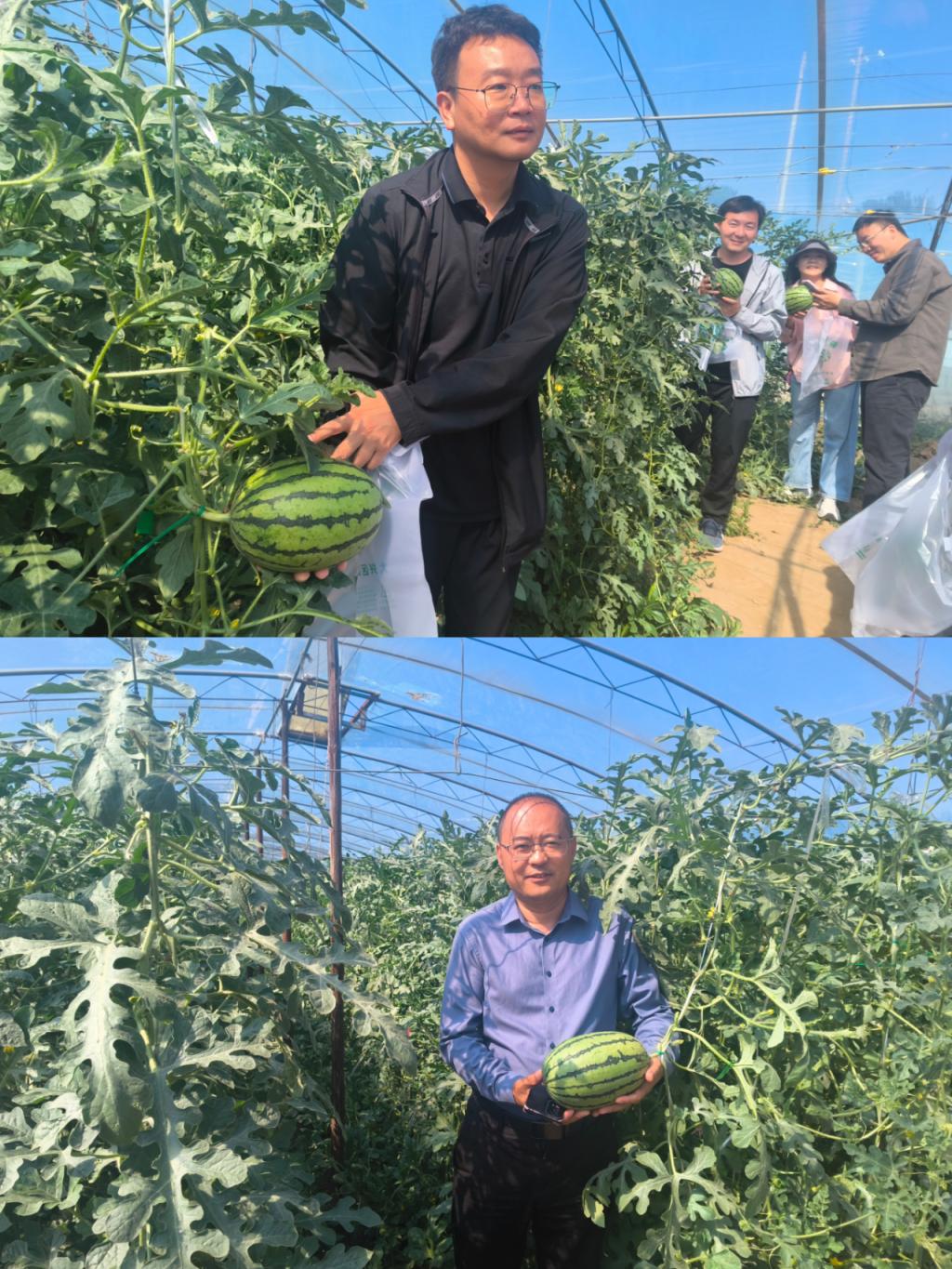 午后阳光斜映,校友们转战庞各庄西瓜种植基地。绿蔓掩映的瓜田中,卖瓜老板教大家怎样选瓜,不一会,大家就摘了数百斤瓜。