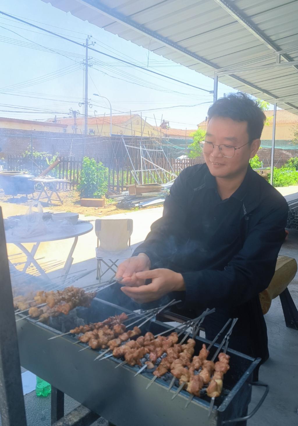 随着炭火噼啪作响,往届"金牌烤官"高建华这次在夫人陪伴下,手持肉串即兴表演,火星飞舞间尽显江湖豪气。浙江校友会副秘书长04环艺余广、黄科院建筑行业(河南)校友会副会长93工民建闫光荣恰好来京参加了小聚,也坐在碳火前秀了一下烧烤。