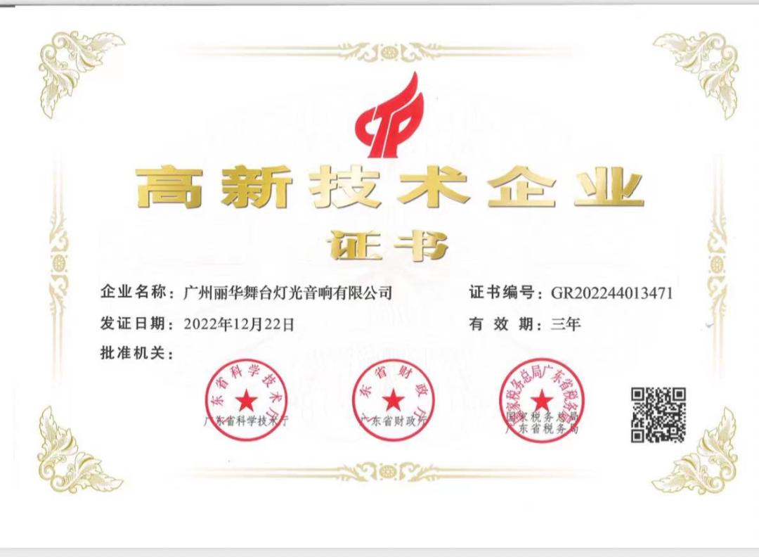目前,公司拥有现代化生产的无尘车间、数控自动化生产线、高智能光电产品演示中心以及国际化的企业研发测试中心,作为广州市高新技术企业,先后获得中国LED照明应用百强企业、AAAA级信用示范单位、节能先锋企业、中国舞台灯光制造企业30强、中国演出行业会员单位、市创新型企业等殊荣。这些先进的设备和技术为丽华的健康发展提供了强有力的硬件支撑。