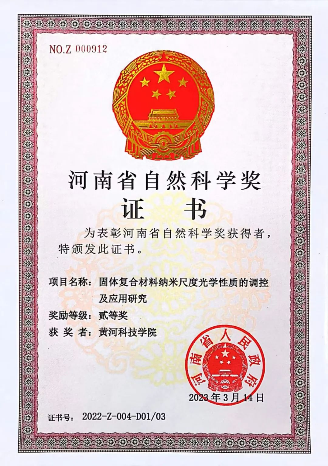 近日,河南省人民政府公布了2022年度河南省科学技术奖励名单。我校纳米功能材料研究所杨保成教授团队主持完成的成果《固体复合材料纳米尺度光学性质的调控及应用研究》荣获河南省自然科学奖二等奖。这是我校首次获得此项奖励,也是我校在科学技术奖方面取得的新突破。