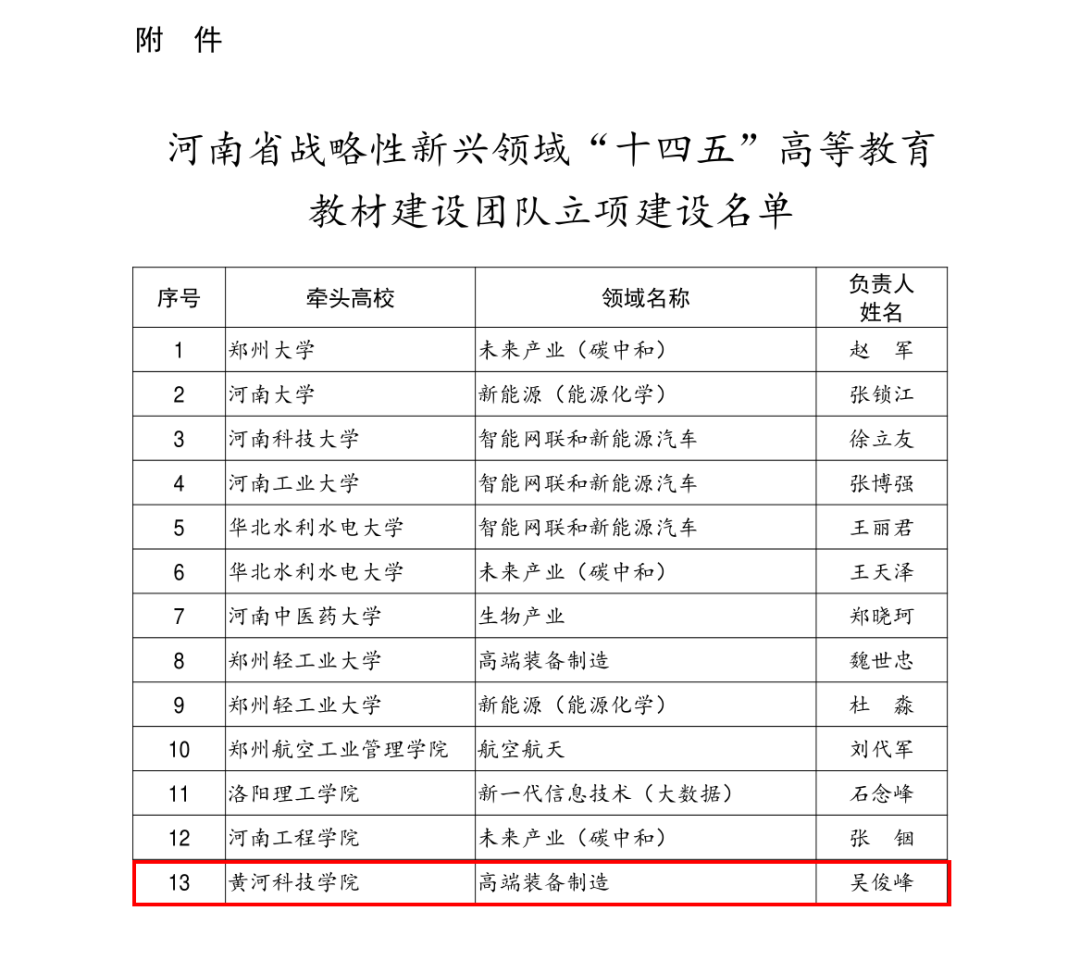 近日,河南省教育厅公布河南省战略性新兴领域“十四五”高等教育教材建设团队立项名单,我校教师吴俊峰主持的“高端装备制造”教材建设团队入选。全省共立项13个团队,11所高校分别牵头组织,我校为唯一牵头建设的民办高校。