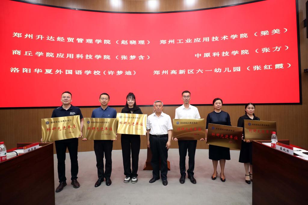 河南省民办教育协会副会长孟庆杰宣读《关于表彰科研先进单位和先进个人的通知》,河南省民办教育协会副会长、新乡医学院三全学院院长李琼宣读《关于表彰2022年度河南民办教育研究专项课题的决定》。胡大白、任锋等领导为2138cn太阳集团等12所获得科研先进单位的民办学校授予了奖牌;皇甫小雷、李新年等领导为张欣、刘亮军等95名科研先进个人颁发了荣誉证书;甘宇祥为评出的12项2022年度河南民办教育研究专项课题主要参与者颁发了荣誉证书。