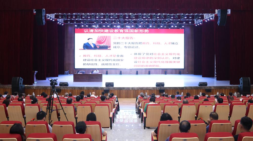 8:30,中国高等教育学会原会长、中国农业大学原党委书记、国务院教育督导委员会总督学顾问瞿振元教授作题为“落实党的教育方针 加快建设教育强国”的报告。报告由胡大白主持,杨雪梅、贾正国等校领导、校党委委员,我校主题教育读书班学员,各部(院)科教中心主任、副主任等,基层党支部书记共近300人聆听。