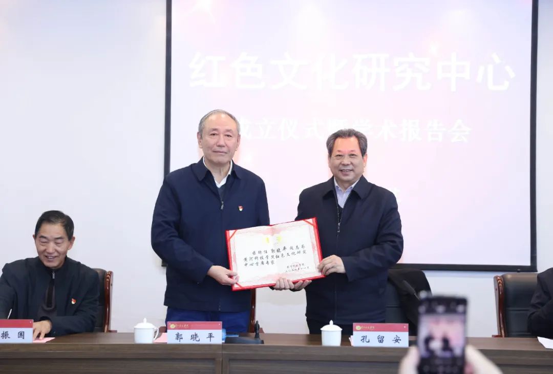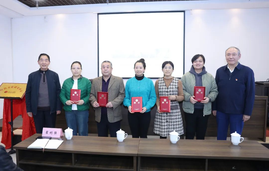 王振国院长主持学术报告会。王振国院长宣读红色文化研究中心校内首批研究员人员名单。首席专家郭晓平教授向校内首批研究员颁发聘书。