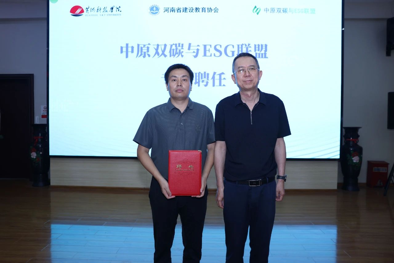 会议中还举行了中原双碳与ESG联盟专家聘书颁发仪式。我校土木建筑科教中心副主任王昂被评为中国双碳与ESG联盟首批专家。