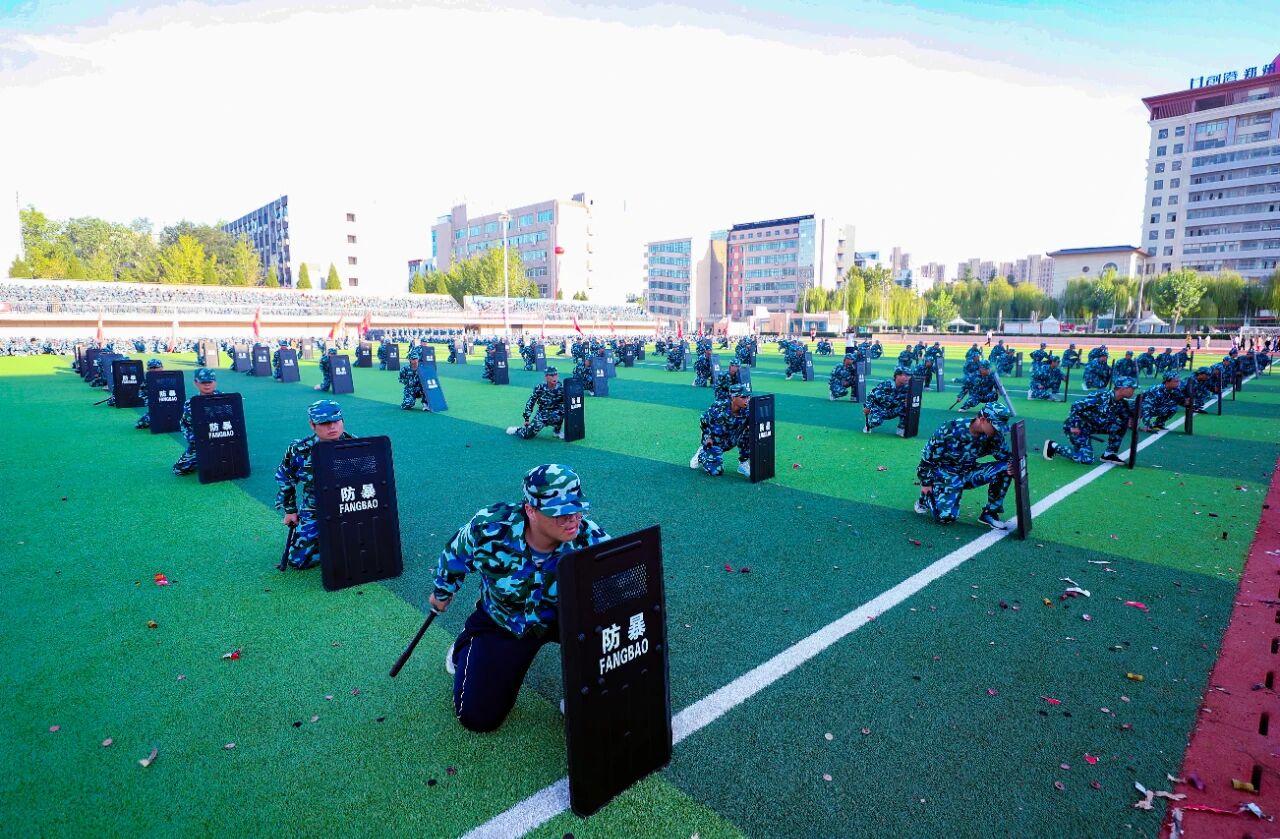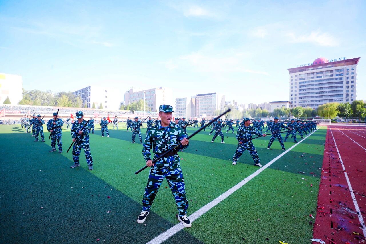 大会在庄严的升国旗、奏唱国歌仪式中拉开序幕。随后,新生们迈着铿锵步伐,以昂扬的姿态依次通过主席台,展现出新时代青年的蓬勃朝气与坚毅风采。分列式结束后,军事技能课目特色方阵带来了擒敌拳、刺杀操、捕俘拳等多个课目的示范表演,动作刚劲有力,尽显军训成果;艺体学部学子献上的大型歌舞《在希望的田野上》,则以灵动的舞姿与嘹亮的歌声,为现场增添了青春活力。