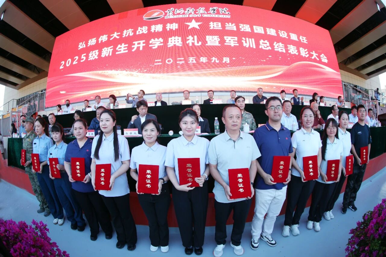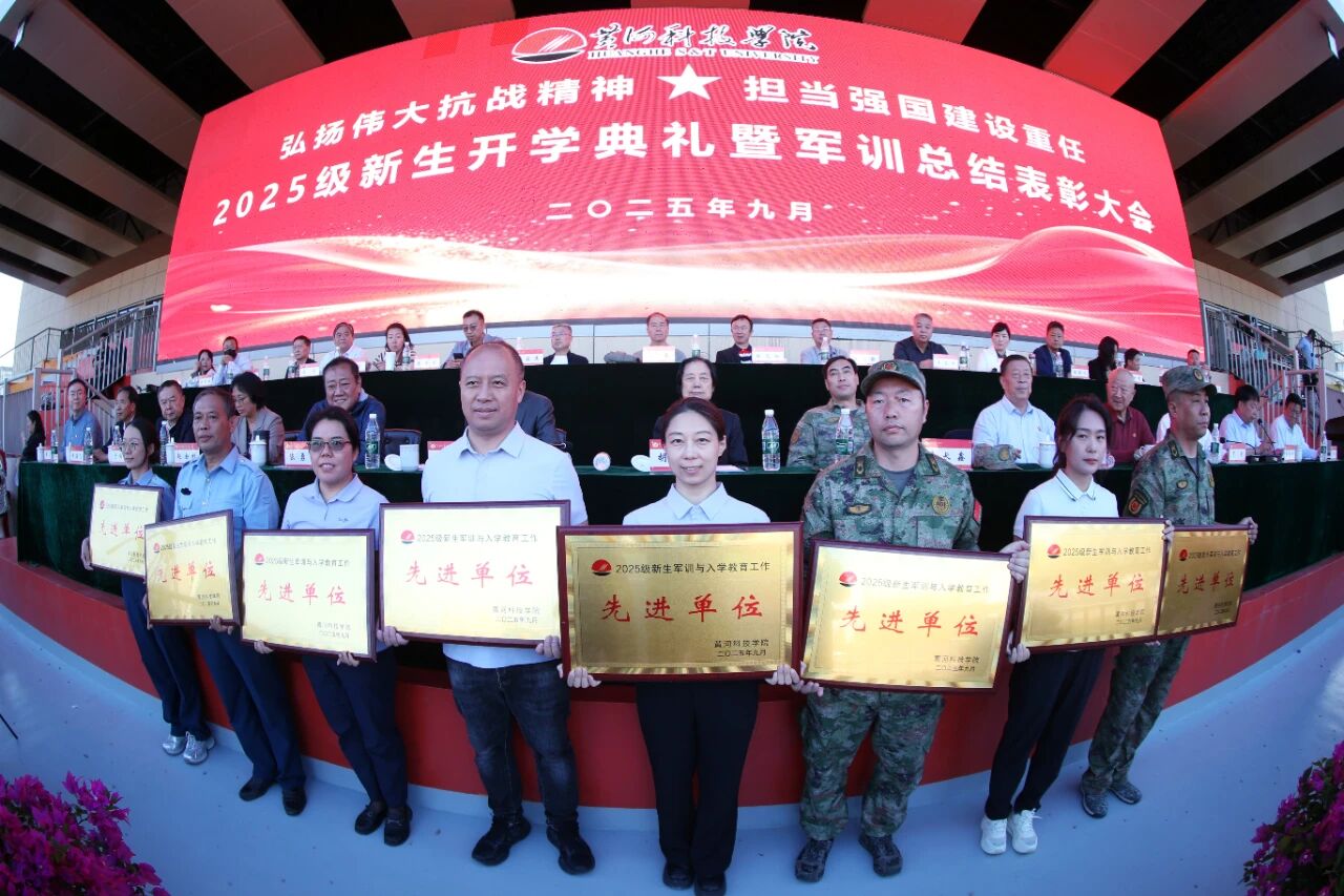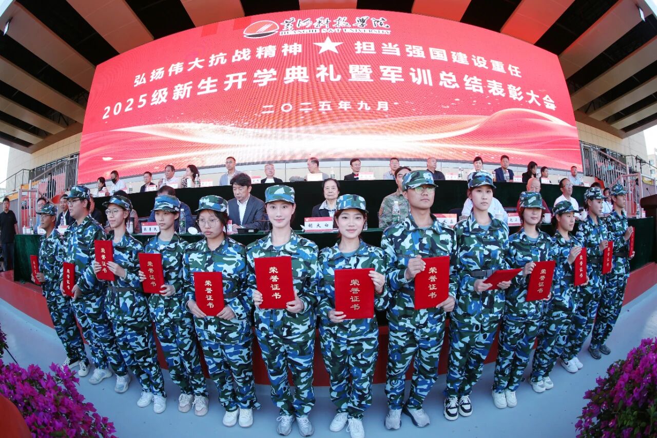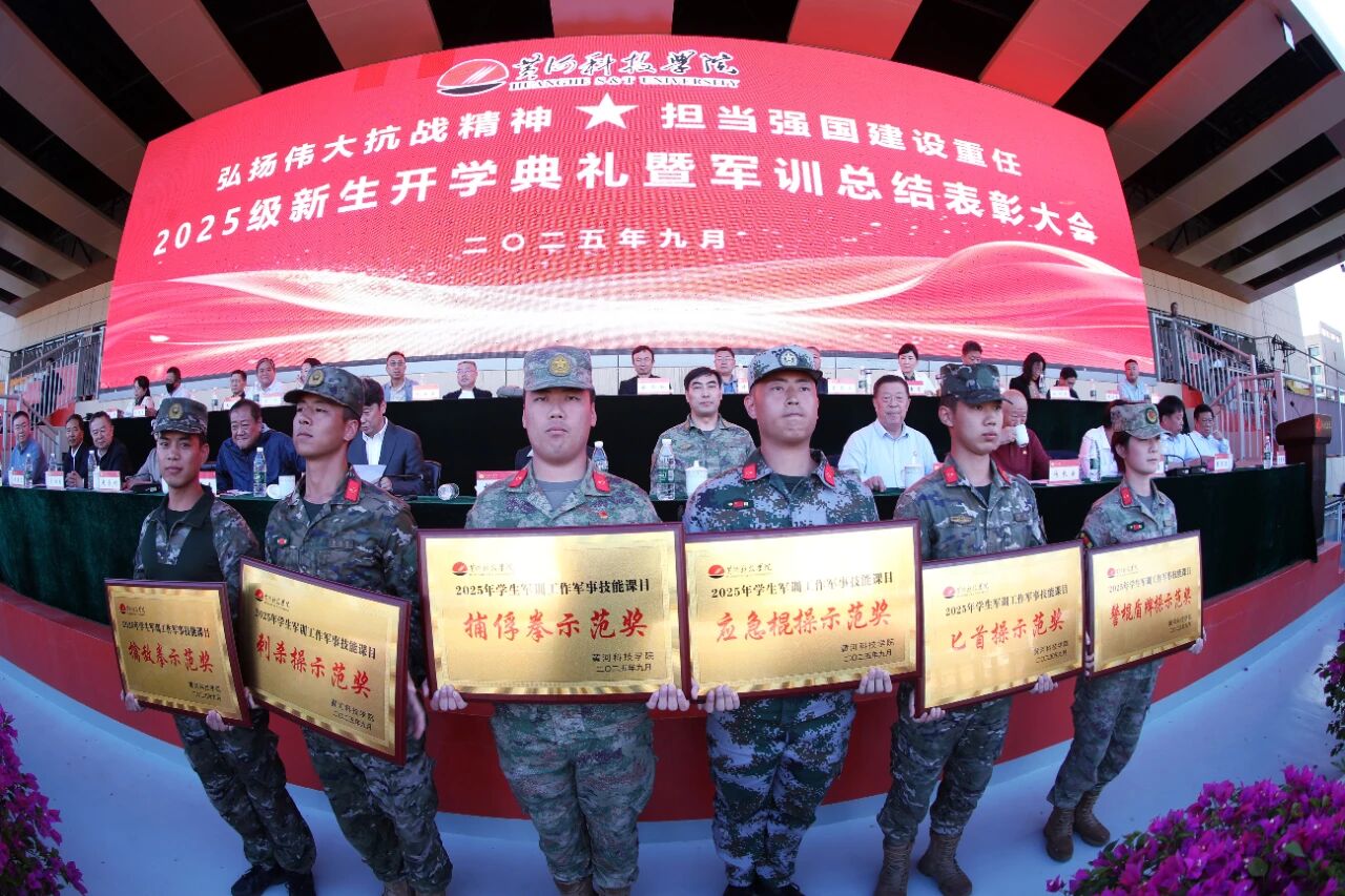 会上,党委副书记赵会利宣读了2025 级新生首批党校学员名单,副校长罗煜宣读了军训与入学教育工作先进集体和个人表彰决定。随后,与会领导为军训与入学教育先进单位、优秀工作者、优秀教官、优秀学员,以及军事技能课目示范奖获奖代表颁奖。值得关注的是,11 位“薪传奖”获得者登台领奖,他们分别来自工学部、艺体学部、商学部、医学部及国际学院,其父辈曾在黄科大求学,这份跨越时光的信任,让“开拓、拼搏、实干、奉献”的黄科大精神在他们身上得以传承。