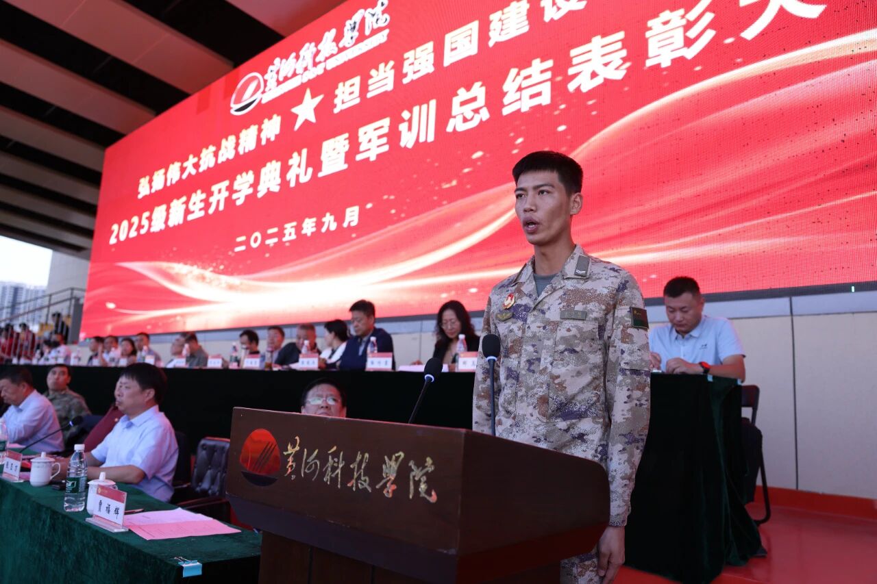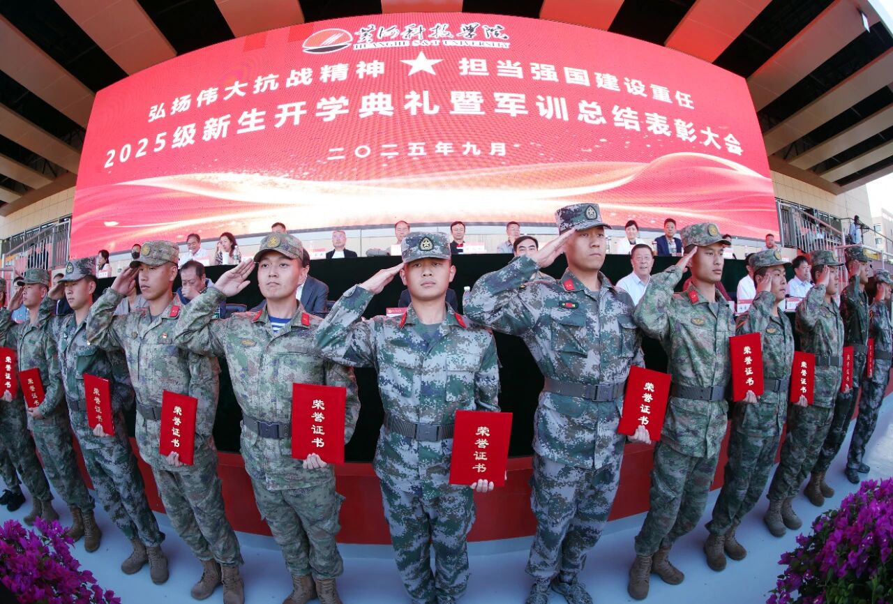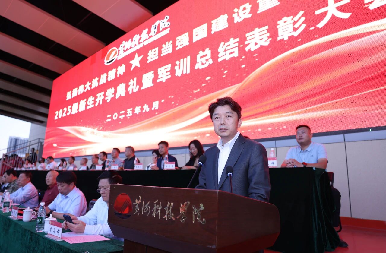 丹桂飘香迎新生,奋楫笃行启新程。9月20日,我校2025级新生开学典礼暨军训总结表彰大会在南校区西田径场举行。全体2025 级新生以饱满的精神面貌,开启了在黄科大的求学新征程。董事长、党委副书记胡大白,二七区区委常委、区人武部上校部长李长鑫,执行董事、校长杨保成,董事会专家咨询委员会主任赵卫东等领导,各学部(院)分党委书记及部(院)长、相关职能部门负责人与2025级普招本专科新生共同出席大会,大会由学生中心主任张丕万主持。