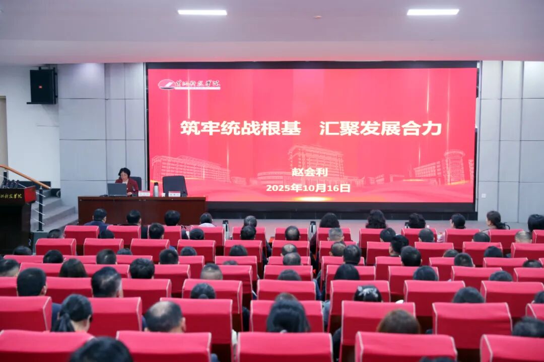 赵会利以“筑牢统战根基汇聚发展合力”为题,为全体参会人员带来了一场内容丰富、思想深刻的专题辅导。她从统一战线在党的百年奋斗历程中的法宝作用切入,系统阐述了统一战线的重要意义和时代内涵,深入领学了习近平总书记关于做好新时代党的统一战线工作的重要思想。