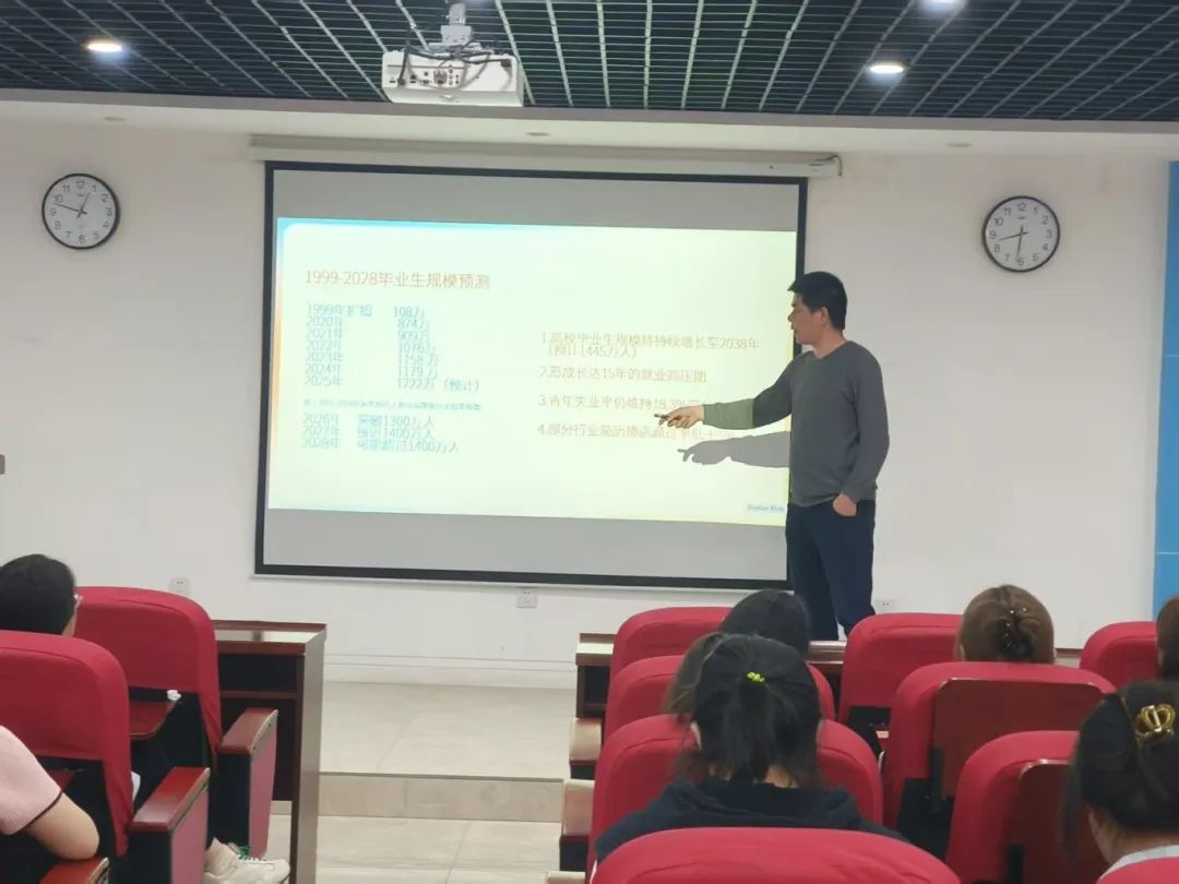 面对当下大学生中存在的“躺平”和“焦虑”的社会现象,王密提出了自己的剖析,同时结合大数据模型分析到:1999年—2028年高校毕业生的规模预测,将在一段时间内,高校毕业生的持续增长,将会不可避免的带来就业高压期这一现象,他鼓励学弟、学妹们要将压力变动力,将挑战视为机遇,敢于接纳自己。同时就如何制订人生职业规划,他提出了合理化建议,包括短期学业目标与技能储备、中期兴趣发展与行业研究、长期职业发展与持续成长等方面。