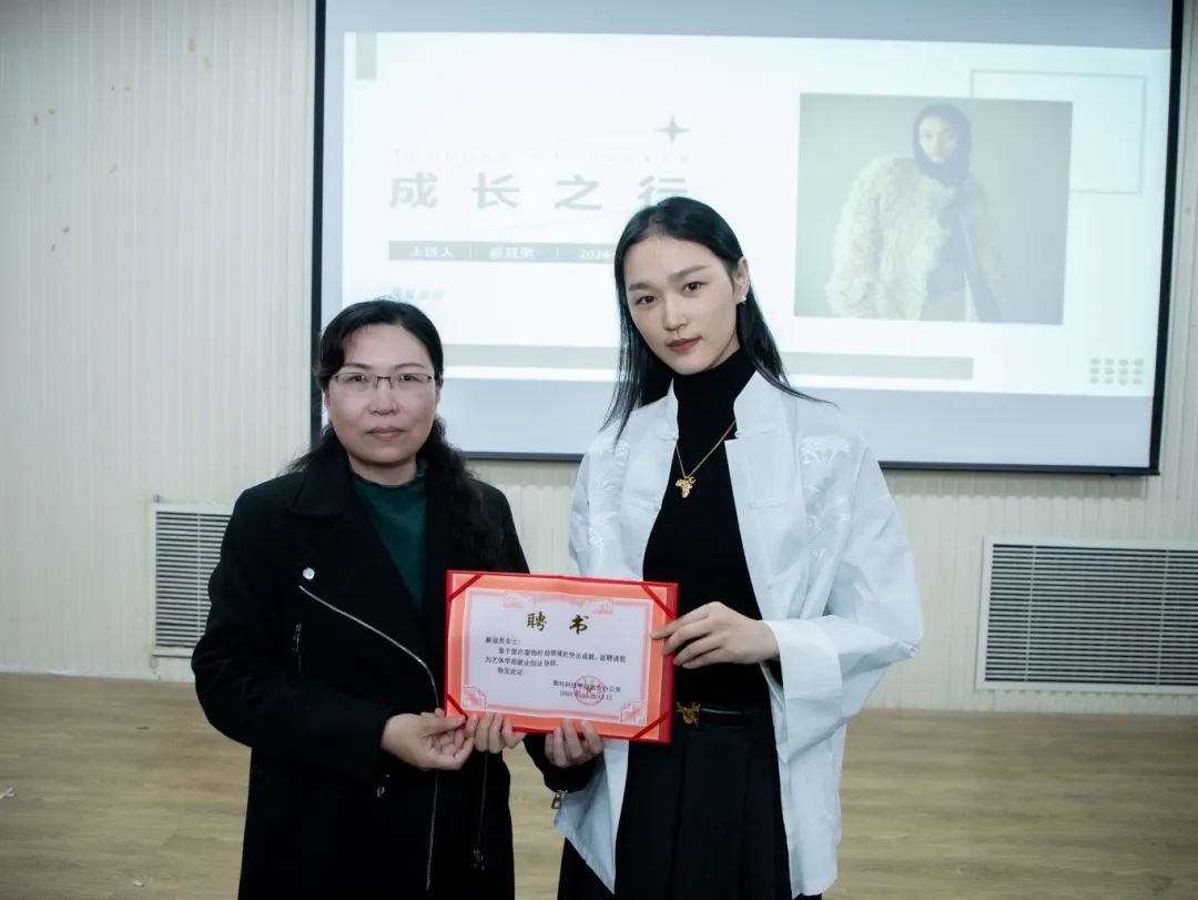 徐照芳首先对蔡冠男的返校表示热烈欢迎,并向同学们简要介绍了蔡冠男校友的成长经历。张笑非为蔡冠男颁发聘书,聘请她担任服装与服饰设计专业就业创业导师。