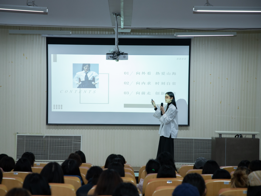 蔡冠男以“向外看-热爱山海,向内求-时刻自省,向前走-创新突破”为主题,从服装展示的角度来谈服装设计与时尚产业的关系,分享了自己的从业生涯和不断的提升经历,以及以什么的信念与精神,鼓励着自己从一名大一学生一步步走向国际舞台,并被多家国际高级时装公司认可。她提出:“一个人的成功除了要有扎实的专业基础之外,更要确定适合自己的道路,不断努力,去坚持;永远要专注的提升自己 ,在年轻的时候不断为自己加筹码”。
