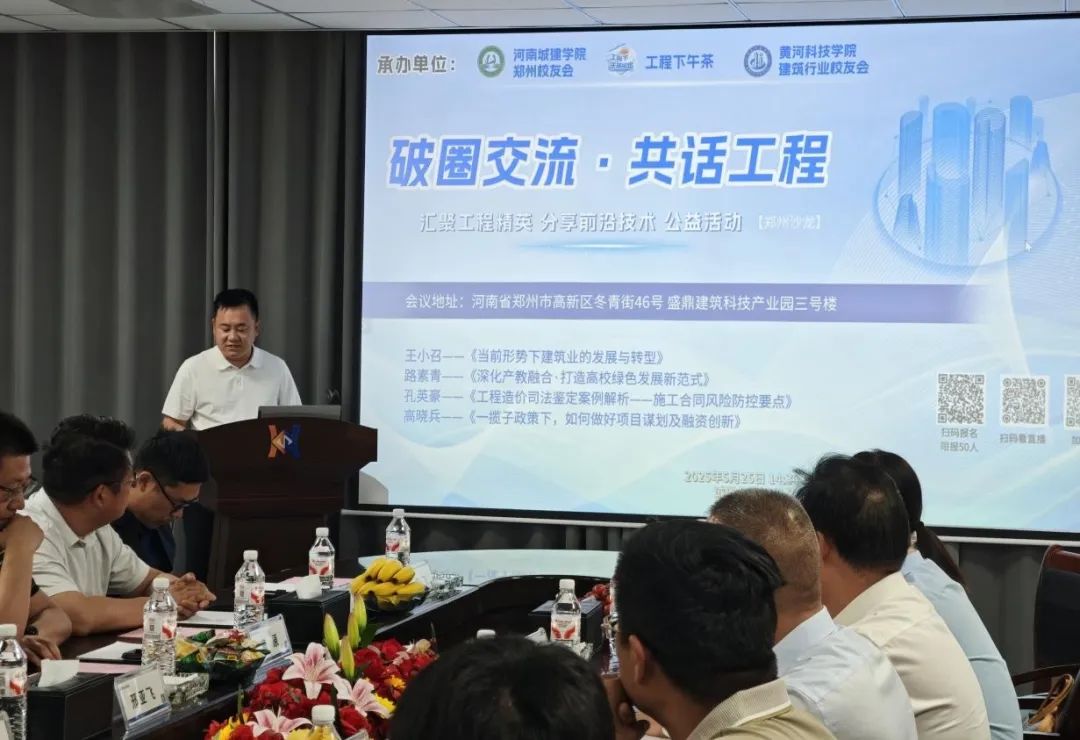 2025年5月25日下午,由2138cn太阳集团建筑行业(河南)校友会、河南城建学院郑州校友会联合主办的工程下午茶-"破圈交流·共话工程"主题研讨活动在校友企业明天建设集团11楼会议中心成功举办。